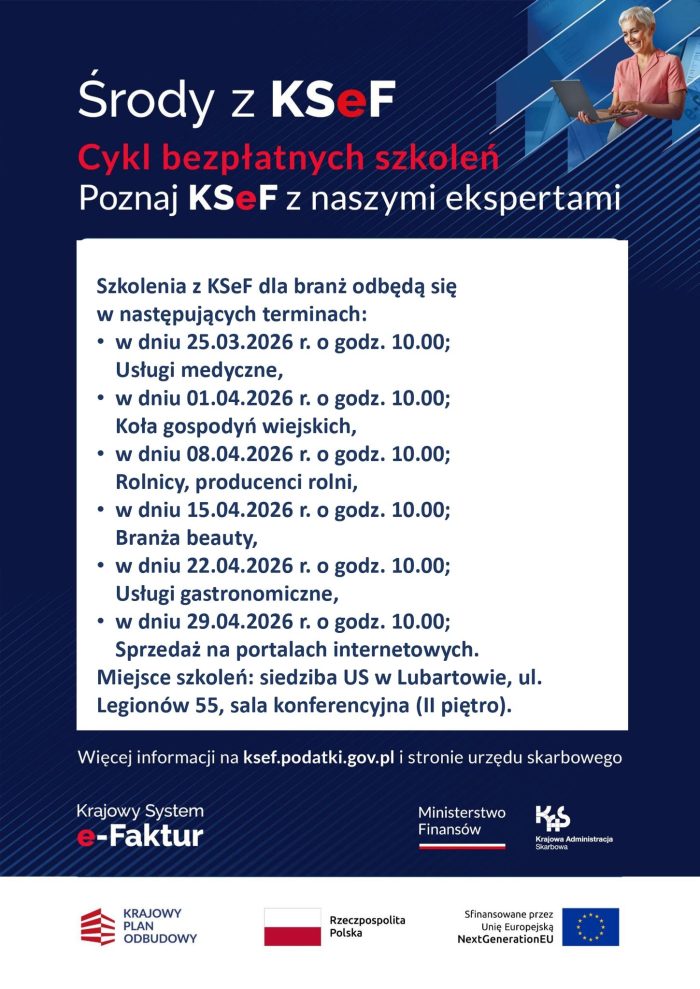 Urząd Skarbowy w Lubartowie zaprasza na cykl bezpłatnych szkoleń dotyczących Krajowego Systemu e-Faktur (KSeF). Harmonogram szkoleń dla branż: – 25.03.2026 r., godz. 10:00 – Usługi medyczne – 01.04.2026 r., godz. 10:00 – Koła gospodyń wiejskich – 08.04.2026 r., godz. 10:00 – Rolnicy i producenci rolni – 15.04.2026 r., godz. 10:00 – Branża beauty – 22.04.2026 r., godz. 10:00 – Usługi