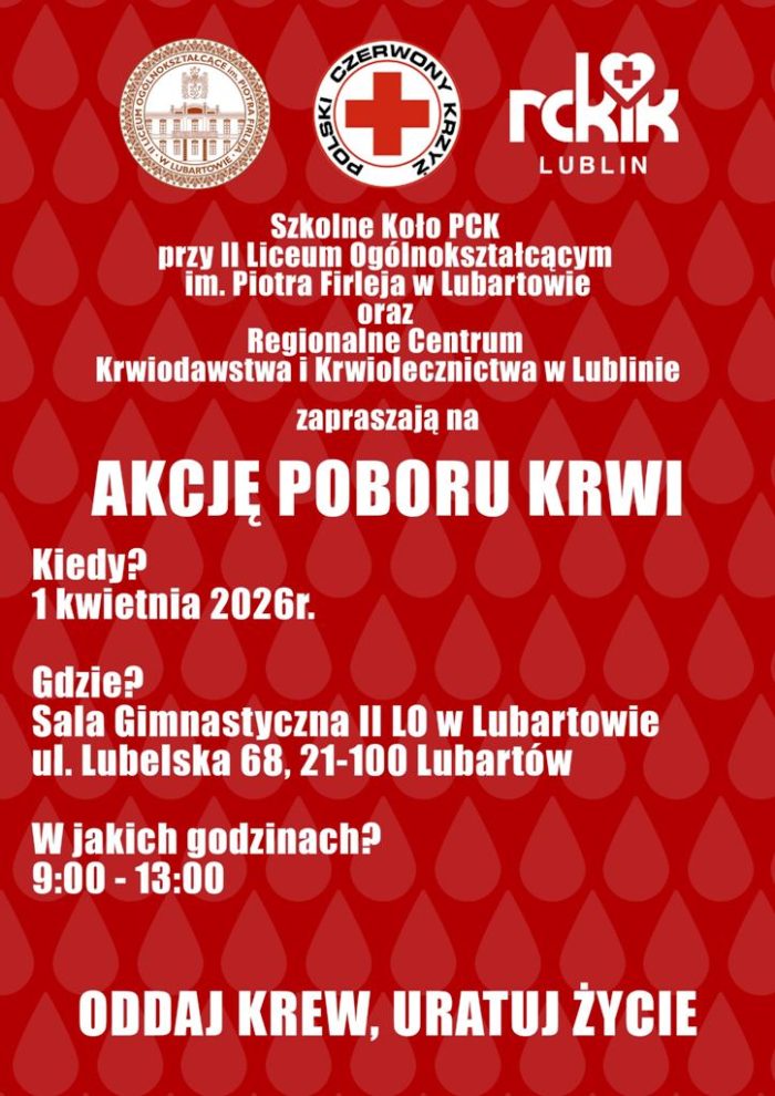 II LO w Lubartowie, Polski Czerwony Krzyż oddział regionalny w Lubartowie oraz Regionalne Centrum Krwiodawstwa i Krwiolecznictwa w Lublinie zapraszają 1 kwietnia w godz. 9:00 – 13:00 na akcję poboru krwi. Krew będzie można oddawać w sali gimnastycznej II LO przy ul. Lubelskiej 68.