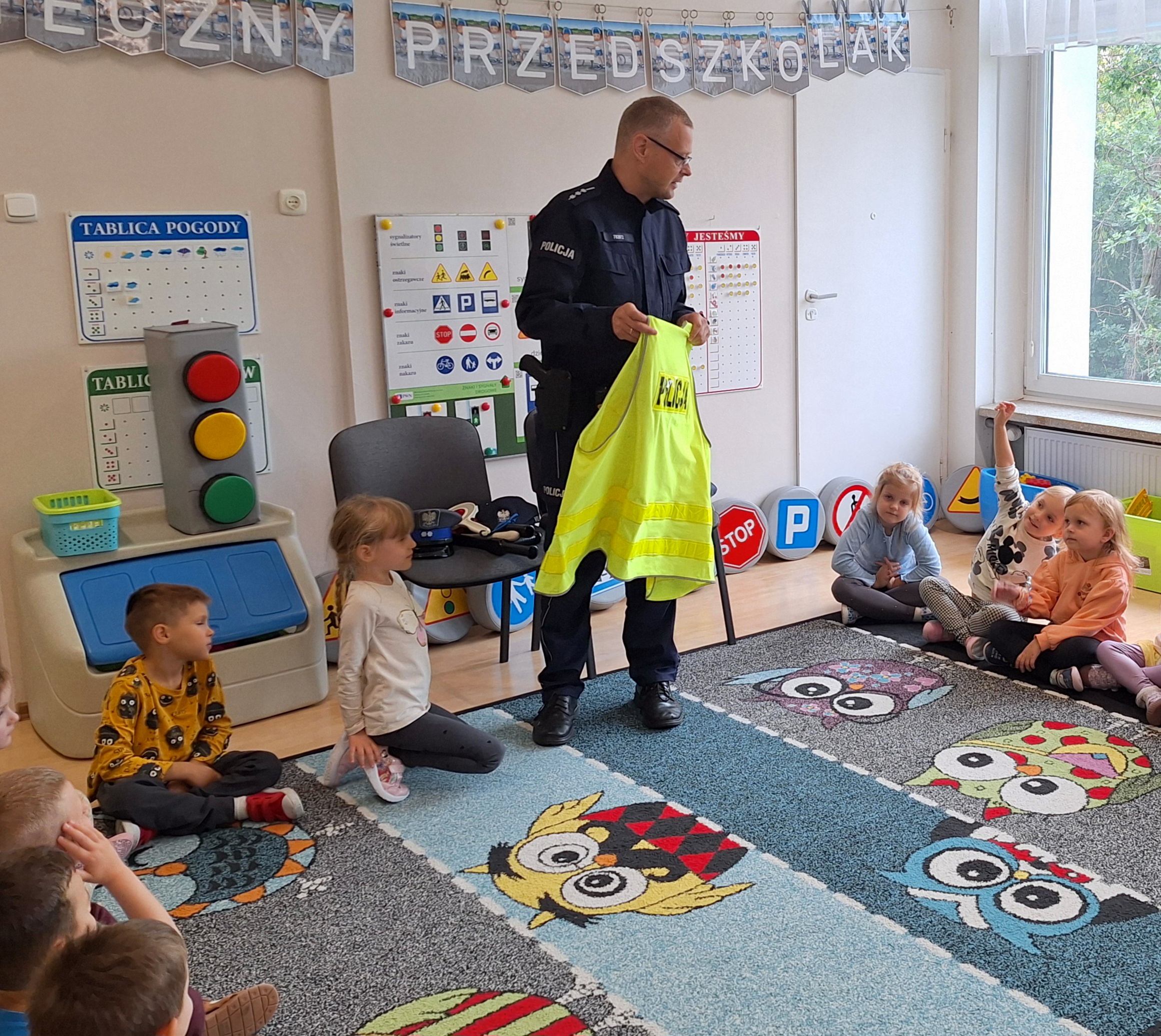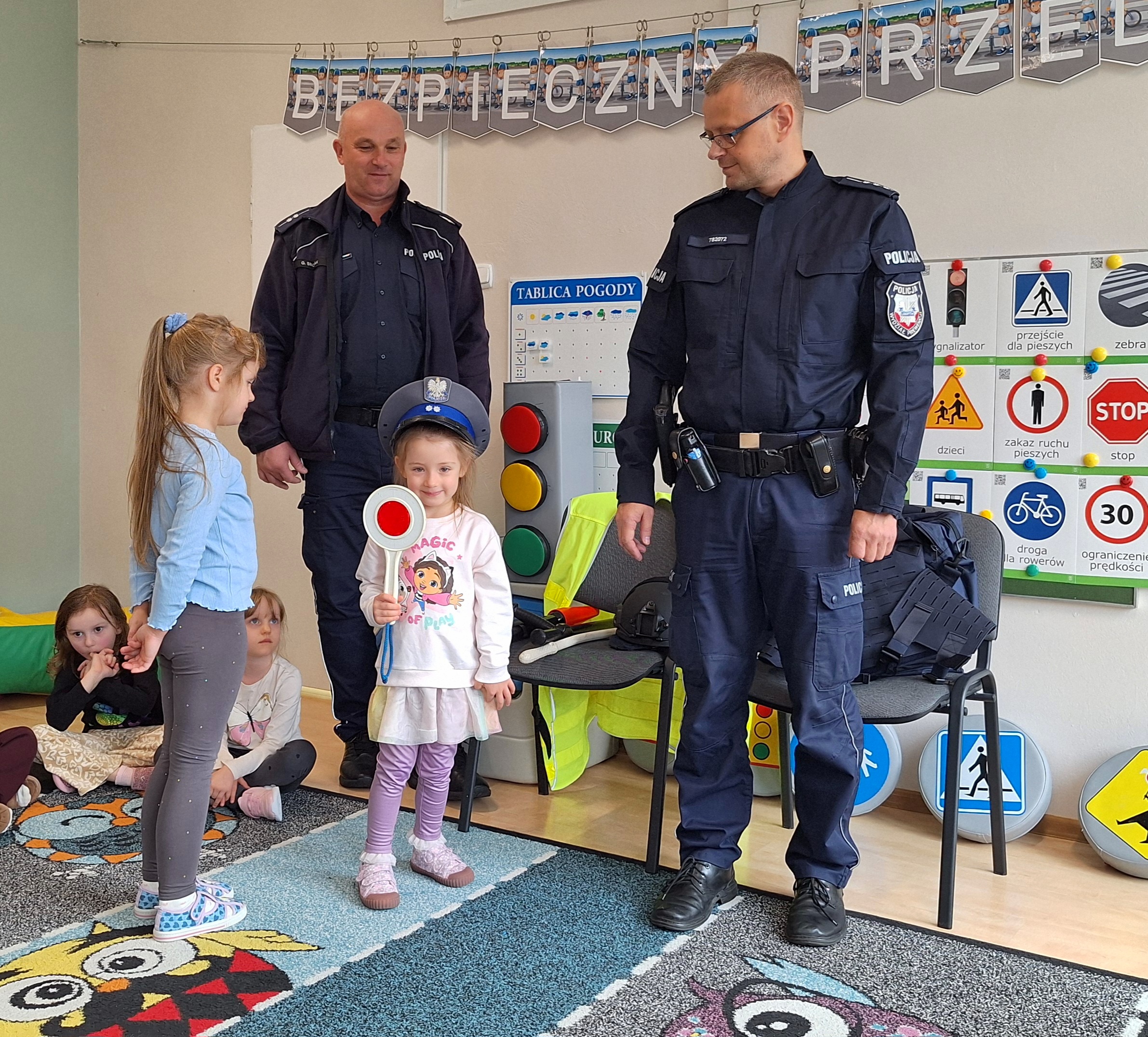 Podczas wizyty policjanci w przystępny i ciekawy sposób opowiedzieli dzieciom o swojej pracy oraz o tym, jak dbać o bezpieczeństwo na drodze, w domu i w przedszkolu. Przedszkolaki usystematyzowały wiedzę o tym, jak prawidłowo przechodzić przez jezdnię, dlaczego warto nosić odblaski i jak zachowywać się w kontaktach z obcymi osobami.