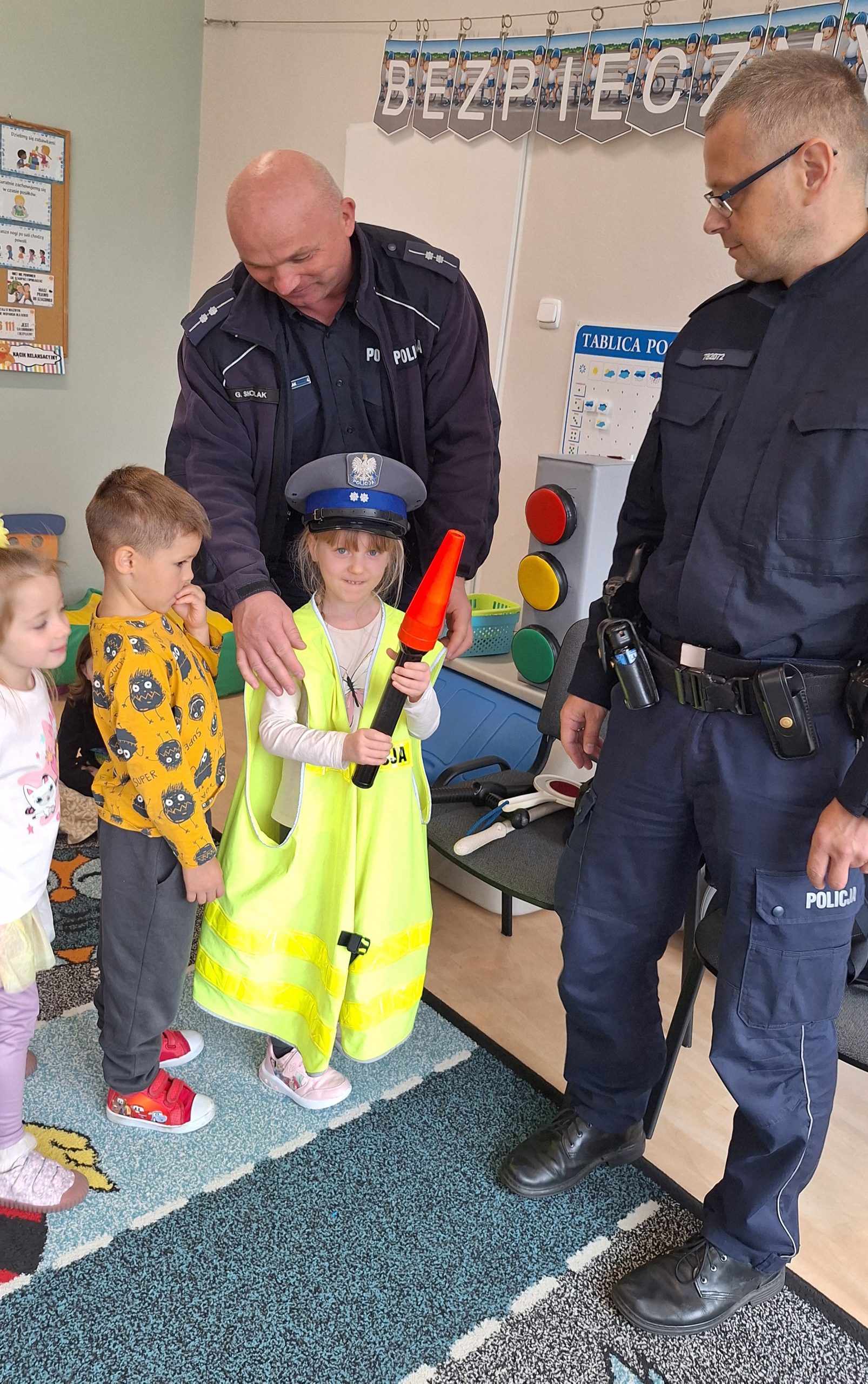 Na zakończenie spotkania każdy przedszkolak otrzymał odblaskowy upominek, który ma przypominać o tym, jak ważne jest bycie widocznym na drodze. Nie zabrakło również wspólnego zdjęcia oraz serdecznych podziękowań dla funkcjonariuszy za ciekawe spotkanie i poświęcony czas.