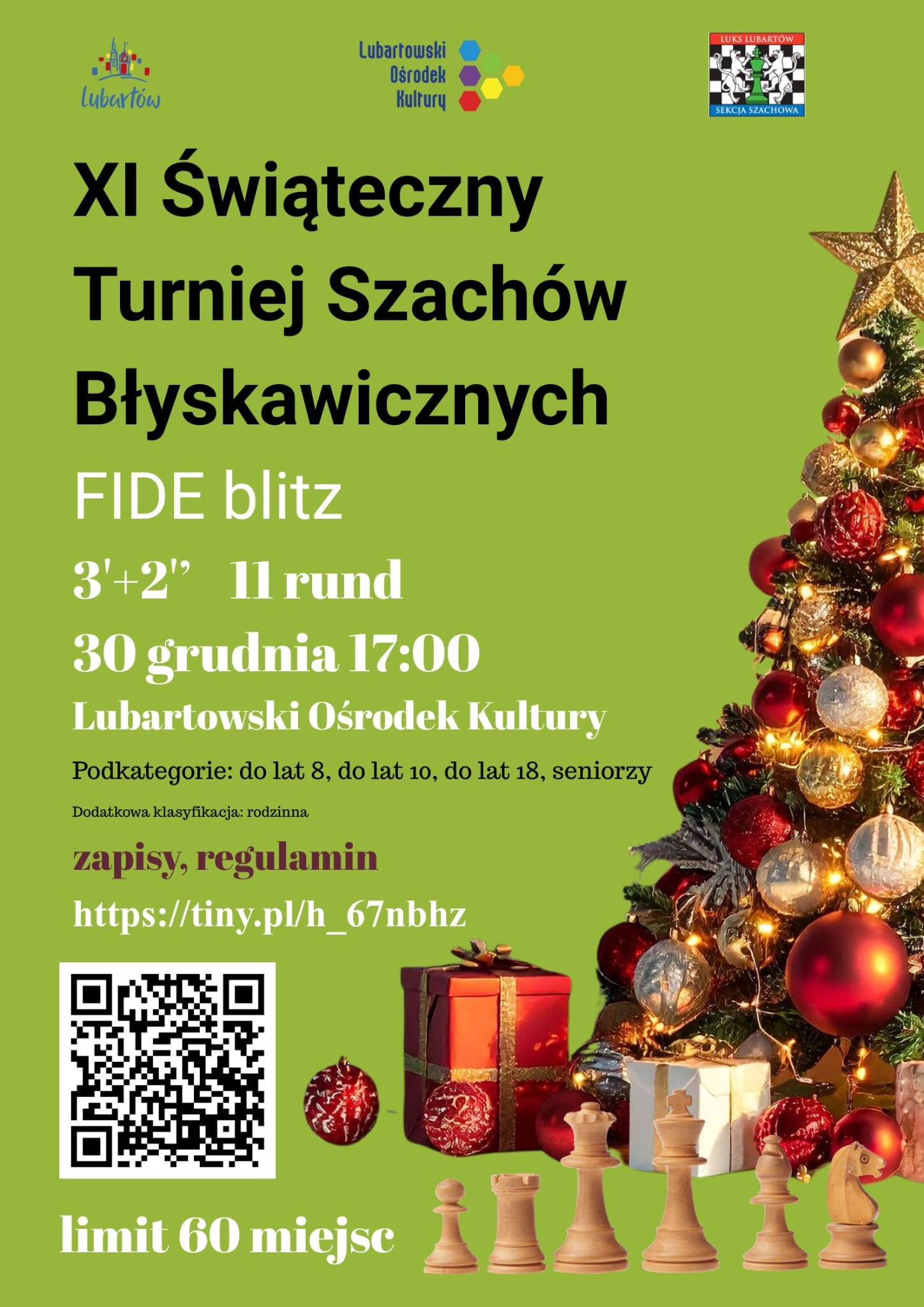 Lubartowski Uczniowski Klub Sportowy oraz Lubartowski Ośrodek Kultury zapraszają wszystkich chętnych umiejących grać w szachy do udziału w „XI Świątecznym Rodzinnym Turnieju Szachów Błyskawicznych”. Turniej odbędzie się 30 grudnia. Start: godz. 17:00 w LOK.
