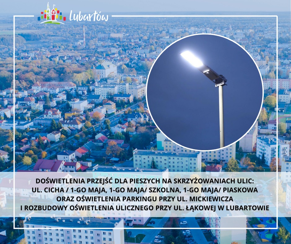 Miasto Lubartów zaprasza do składania ofert na wykonanie doświetlenia przejść dla pieszych na skrzyżowaniach ulic: Cicha/1 Maja; 1 Maja/Szkolna; 1 Maja/Piaskowa oraz oświetlenia parkingu przy ul. Mickiewicza i rozbudowy oświetlenia ulicznego przy ul. Łąkowej w Lubartowie.