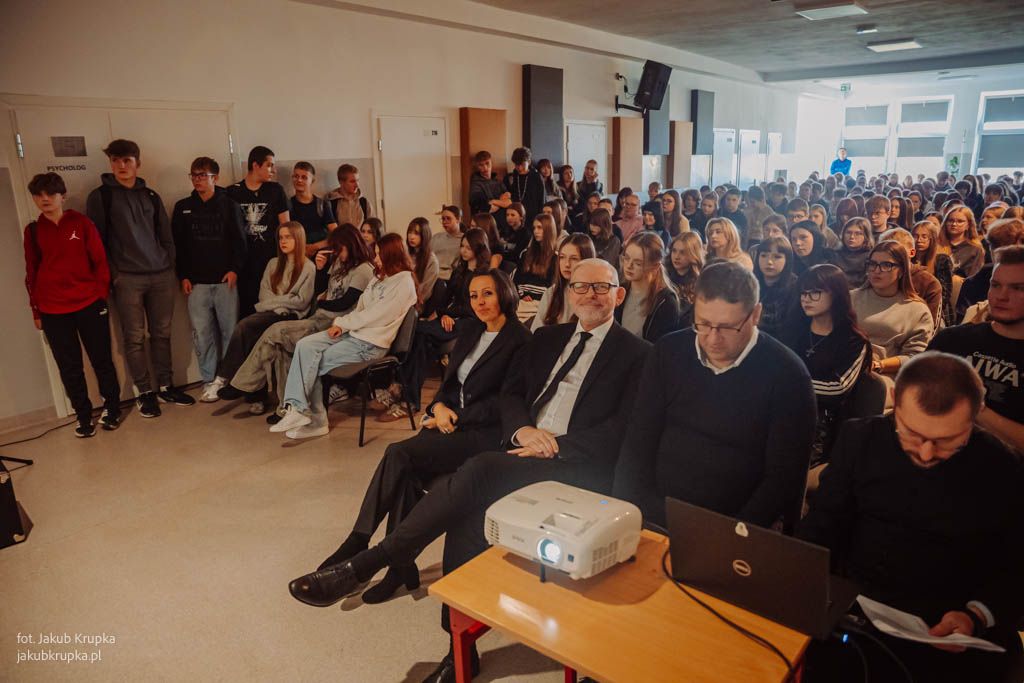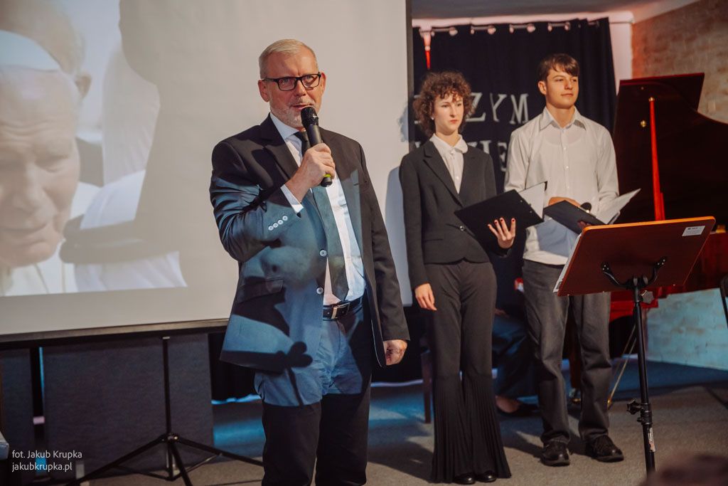 Podczas uroczystości wystąpił szkolny zespół muzyczny, który wzruszająco wykonał pieśni religijne i utwory inspirowane nauczaniem św. Jana Pawła II, obejrzeliśmy archiwalne nagrania – moment wyboru Karola Wojtyły na papieża w 1978 roku, jego pielgrzymki do Polski i spotkania z wiernymi. Ponadto prowadzący uczniowie z zaangażowaniem odczytali najważniejsze wydarzenia z życia Karola Wojtyły – od dzieciństwa w Wadowicach, przez lata kapłaństwa, aż po pontyfikat w Watykanie.
