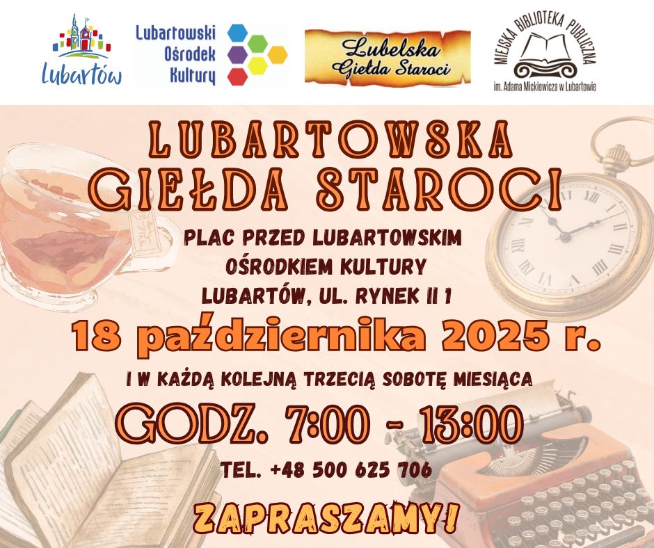Przed nami kolejna giełda staroci w Lubartowie. Już w sobotę 18 października od godz. 7:00 na placu przed ratuszem na stoiskach przygotowanych przez wystawców znajdą się m.in. zabytkowe zegary, porcelana, numizmaty, książki, sprzęty grające i fotograficzne, płyty, zabawki i wiele innych. Organizatorzy zapraszają miłośników i kolekcjonerów unikatowych przedmiotów. Giełda będzie trwać do godz. 13:00.