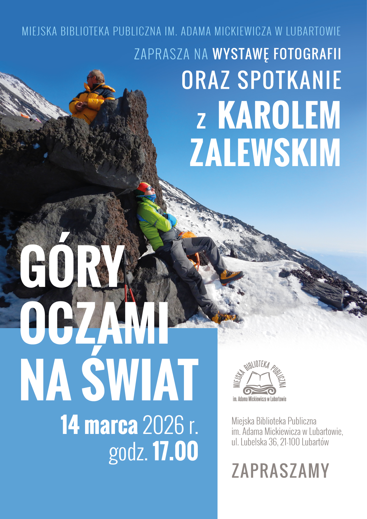 Miłośnicy gór, podróży i fotografii będą mieli wyjątkową okazję spotkać się z człowiekiem, który swoje pasje zamienia w inspirujące opowieści. W sobotę, 14 marca o godz. 17.00 w Miejskiej Bibliotece Publicznej im. Adama Mickiewicza w Lubartowie odbędzie się wystawa fotografii oraz spotkanie z podróżnikiem Karolem Zalewskim, których pochodzi z Lubartowa.