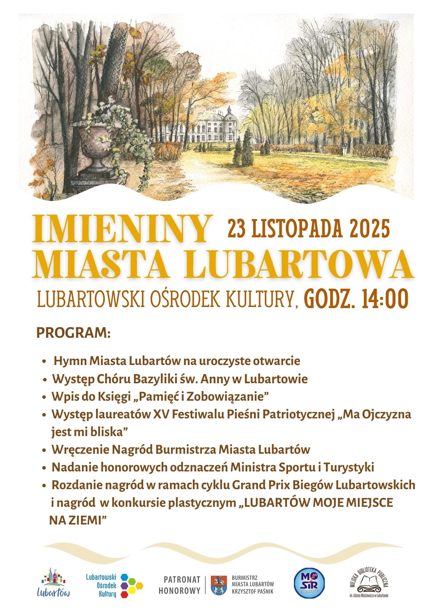 W tym roku obchody 281 rocznicy Imienin Miasta odbędą się 23 listopada o godz. 14:00 w Lubartowskim Ośrodku Kultury. Na uroczystości zapraszają Burmistrz Miasta Lubartów i Miasto Lubartów.