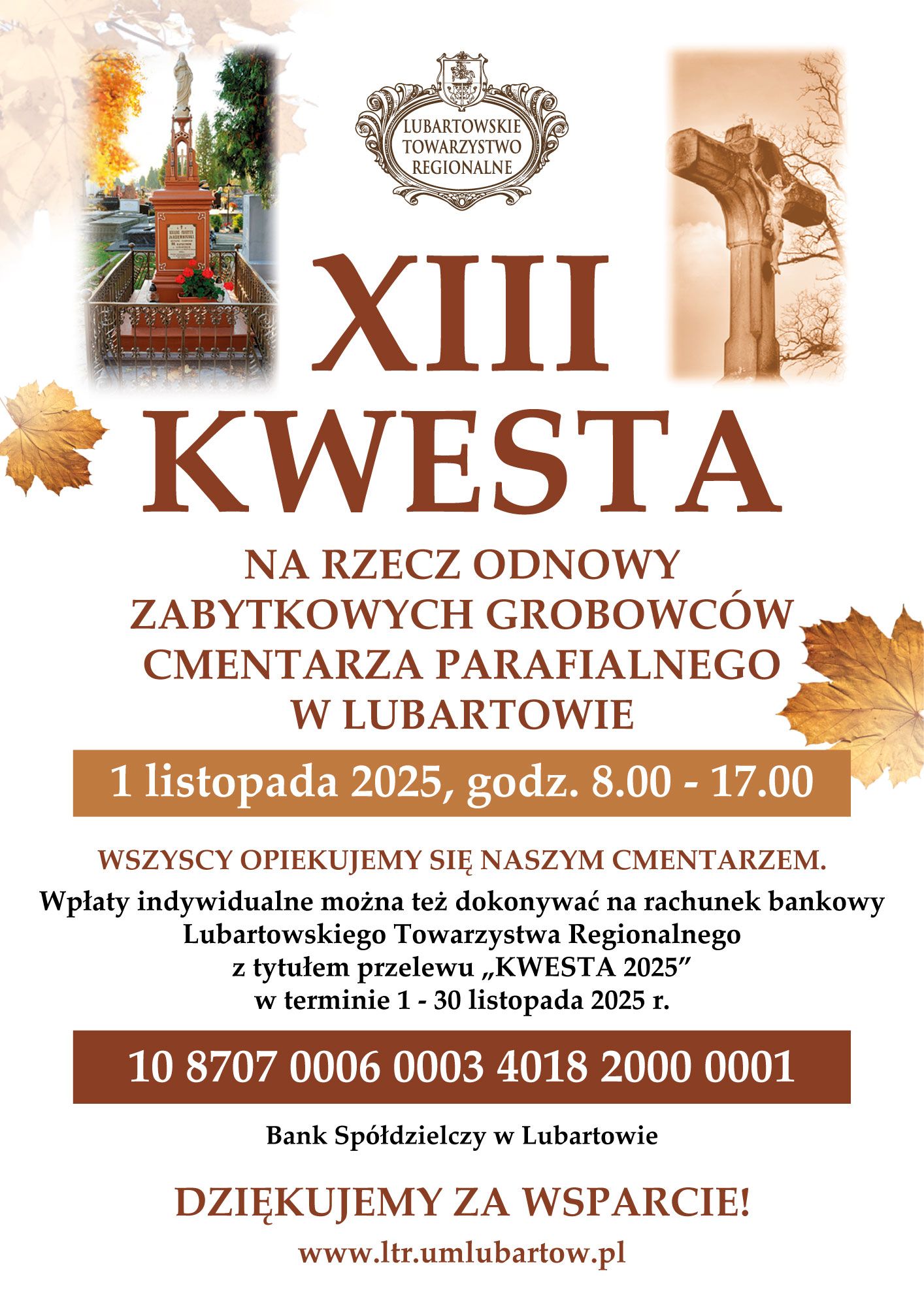 Organizatorzy zwracają się z serdeczną prośbą o wsparcie tej inicjatywy – na miarę swoich możliwości. Każda ofiarowana złotówka pomoże ocalić od zapomnienia groby, które są świadectwem naszej wspólnej historii.