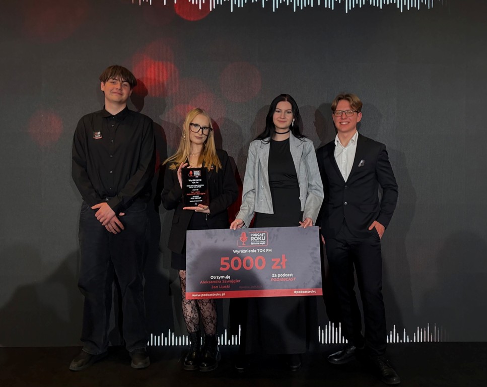 W Andrzejkowy wieczór 29 listopada w Rzeszowie Ola Szwajgier z kl. IV d, Janek Lipski z kl. III a, Paulina Mazurek z kl. III a i Karol Żelazek z kl. III d uczestniczyli w gali rozdania nagród w ramach konkursu „PODCAST ROKU” imienia redaktora Janusza Majki.