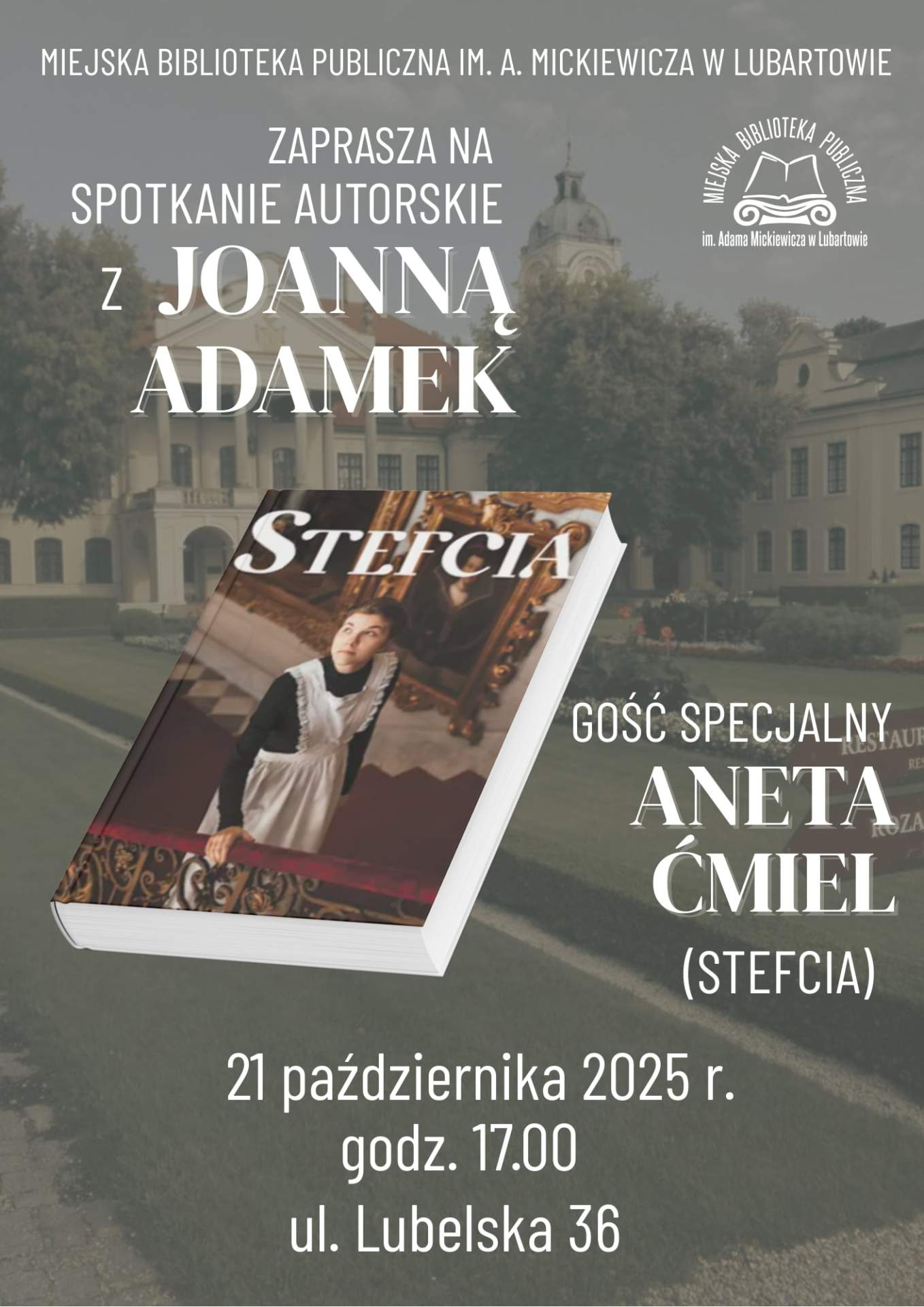 Spotkanie autorskie z Joanną Adamek – reżyserką, scenarzystką, główną specjalistką ds. promocji i marketingu w Muzeum Zamoyskich w Kozłówce, a także pomysłodawczynią internetowego serialu o młodej służącej – Stefci i autorką książki o tym samym tytule, organizuje Miejska Biblioteka Publiczna im. Mickiewicza. Gościem specjalnym będzie Aneta Ćmiel – aktorka wcielająca się w rolę Stefci.