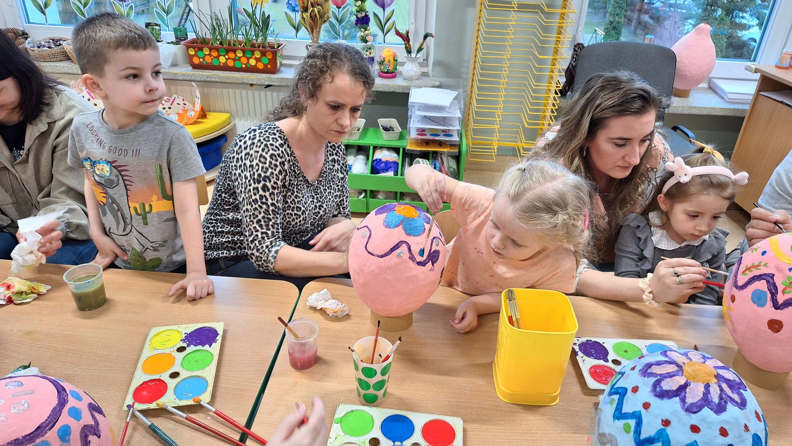Podczas zajęć nasze przedszkole zamieniło się w prawdziwe centrum twórczości i rodzinnej radości. Mali artyści wraz z rodzicami zamienili zwykłe materiały w prawdziwe dzieła sztuki. Dzieci i rodzice malowali pisanki na dużych jajkach wykonanych techniką papier – mâché, tworząc barwne kompozycje. Efektem pracy były prawdziwe kolorowe cuda, które ozdobią przedszkolne sale i wniosą do nich radosny, świąteczny nastrój. Nie zabrakło śmiechu, radosnych rozmów i wspaniałej atmosfery twórczej współpracy między dziećmi a rodzicami. Warsztaty były nie tylko okazją do rozwijania zdolności manualnych i artystycznych, ale także momentem wzmacniania więzi rodzinnych i integracji społeczności przedszkolnej.
