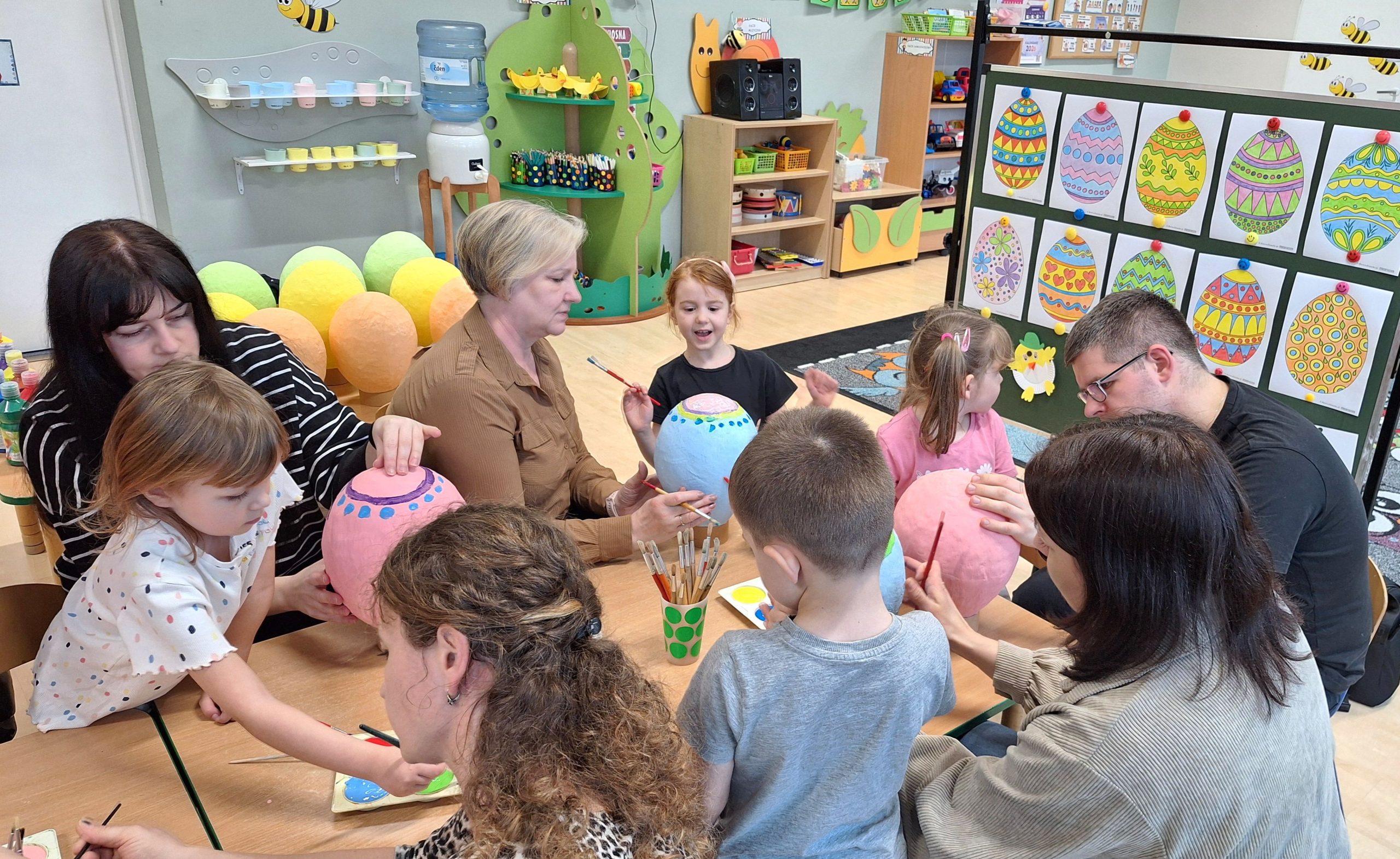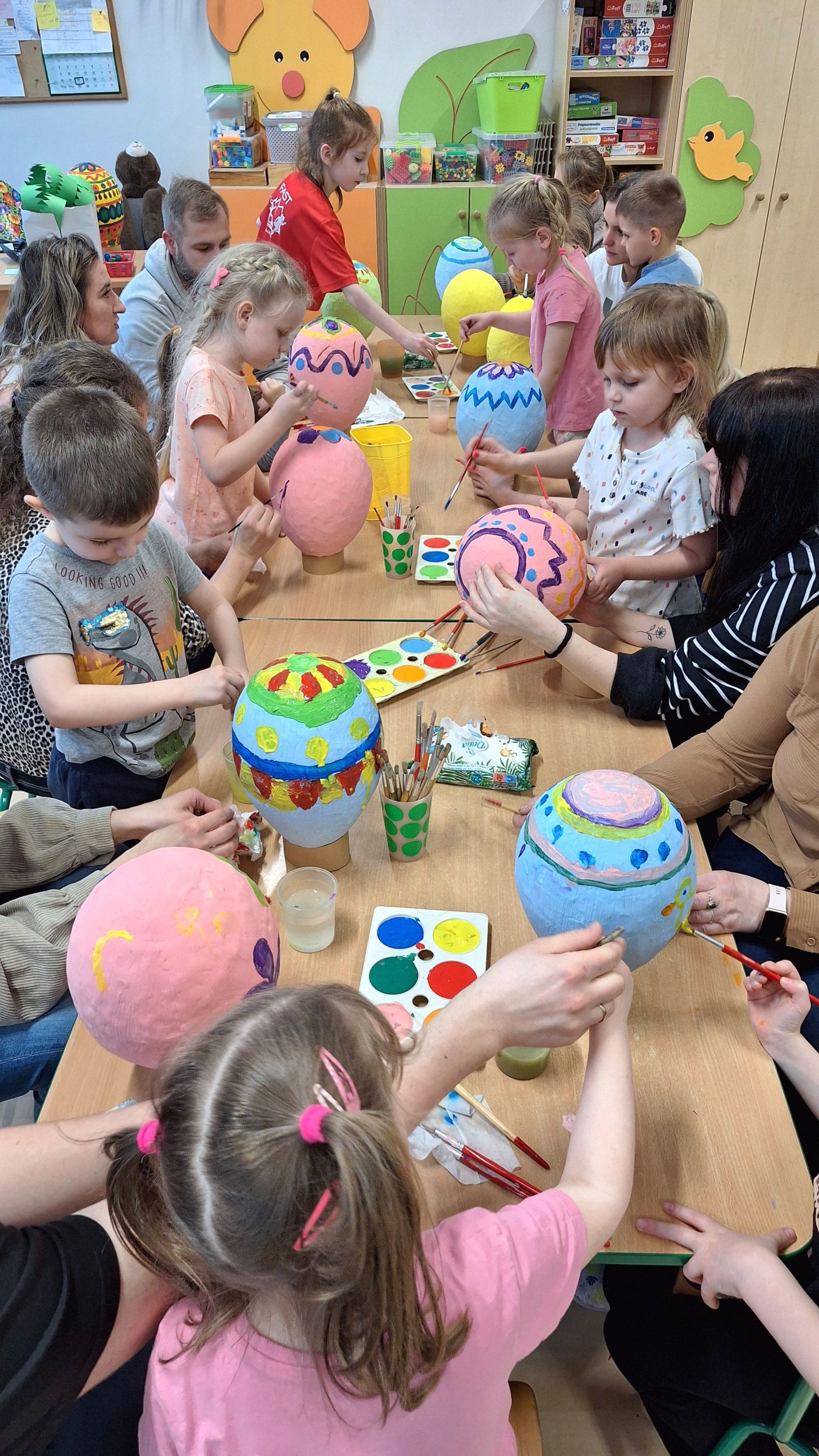 Podczas zajęć nasze przedszkole zamieniło się w prawdziwe centrum twórczości i rodzinnej radości. Mali artyści wraz z rodzicami zamienili zwykłe materiały w prawdziwe dzieła sztuki. Dzieci i rodzice malowali pisanki na dużych jajkach wykonanych techniką papier – mâché, tworząc barwne kompozycje. Efektem pracy były prawdziwe kolorowe cuda, które ozdobią przedszkolne sale i wniosą do nich radosny, świąteczny nastrój. Nie zabrakło śmiechu, radosnych rozmów i wspaniałej atmosfery twórczej współpracy między dziećmi a rodzicami. Warsztaty były nie tylko okazją do rozwijania zdolności manualnych i artystycznych, ale także momentem wzmacniania więzi rodzinnych i integracji społeczności przedszkolnej.