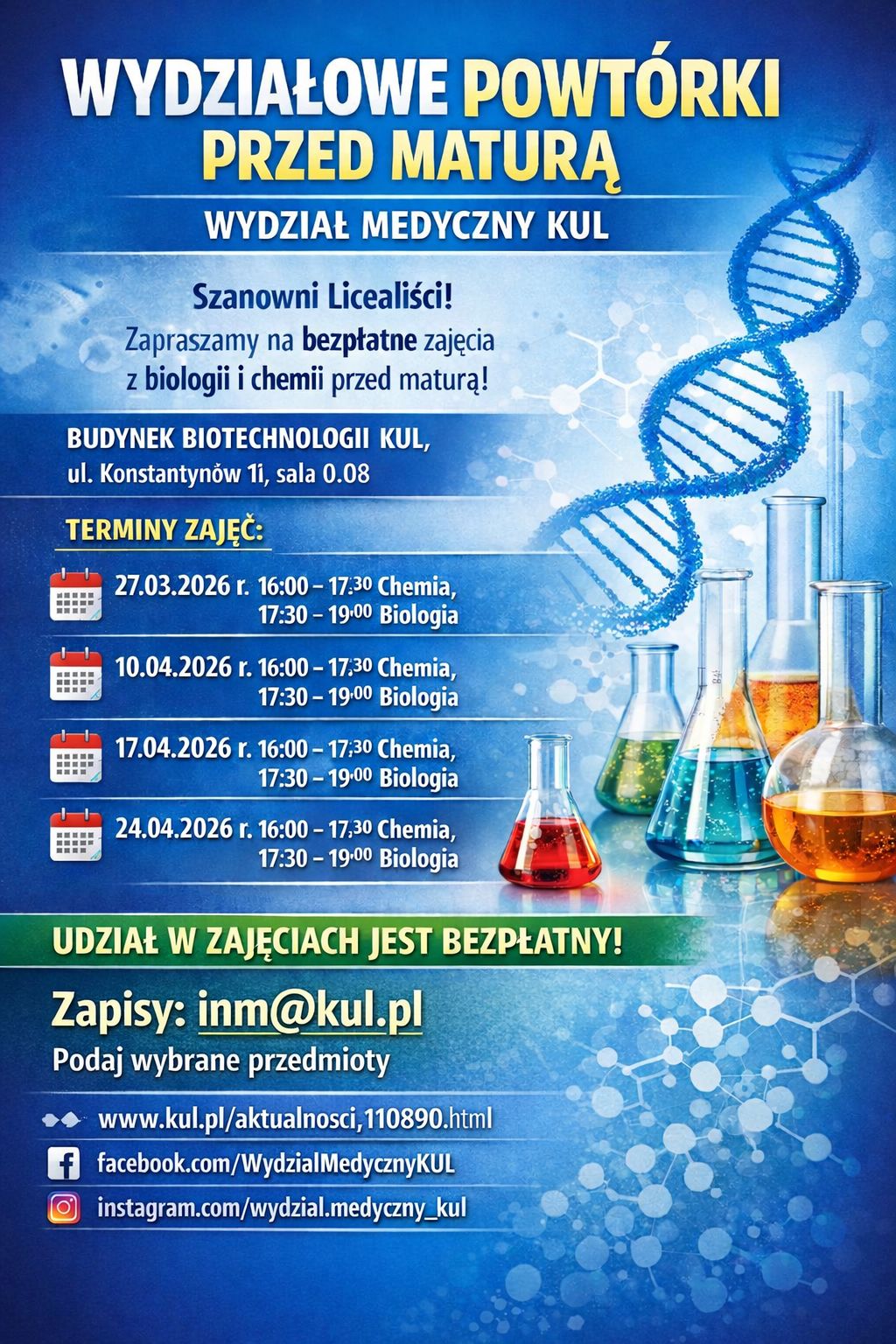 • 10.04.2026 r. godz. 16.00 – 17.30 Chemia, godz. 17.30 – 19.00 Biologia